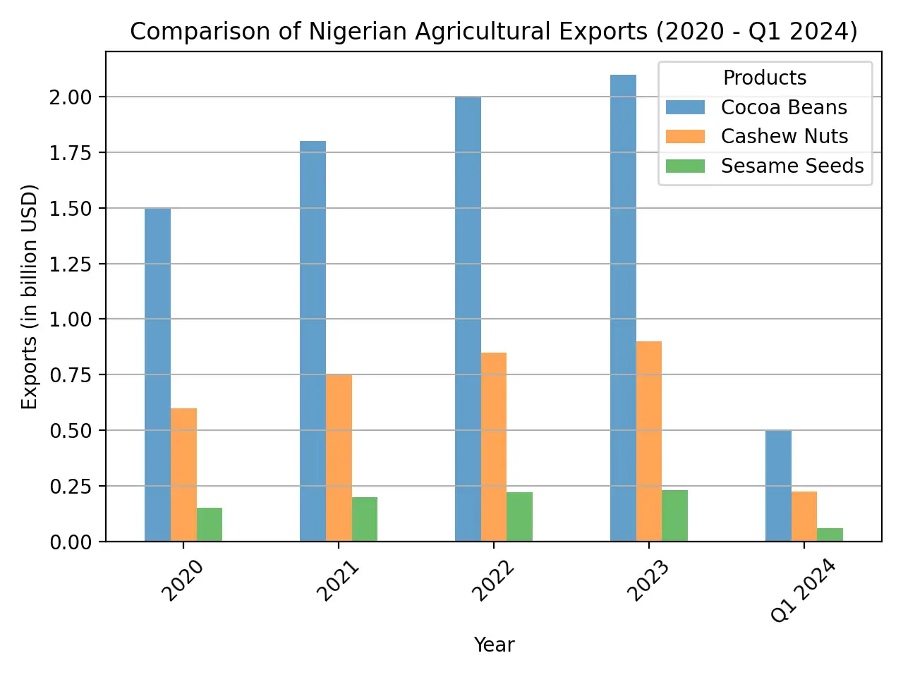 <b>Nigerian Agricultural Exports: (2020 - Q1 2024) (Data: Nigeria Bureau of Statistics)</b> The growth and contributions of Nigeria's key agricultural exports—cocoa beans, cashew nuts, and sesame seeds—to the total export value each year from 2020 to Q1 2024. With cocoa and cashews primarily packaged in jute bags, the rising export volumes highlight the critical need to bolster domestic jute production to meet the growing demand and strengthen Nigeria's agricultural export industry.